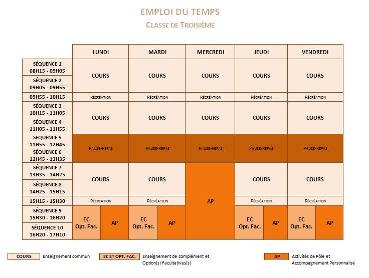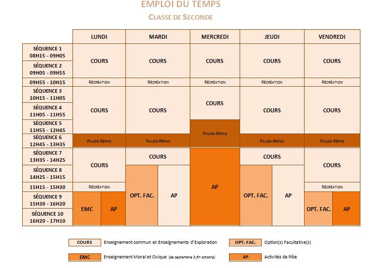 - fin d’après-midi consacrée aux accompagnements et Activités de Pôle « AP » – de 15h15 à 17h10 (options, soutien, approfondissement, orientation, sport et culture),
